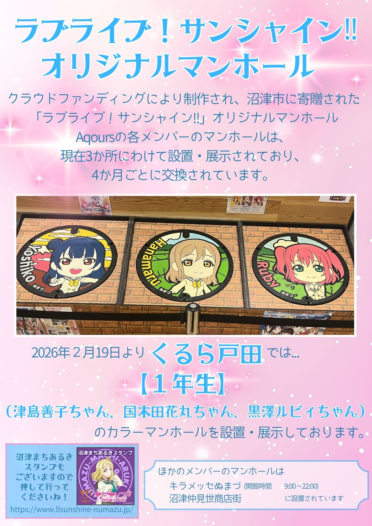 「ラブライブ!サンシャイン!!」オリジナルマンホールが交換されました。 2026年2月28日 by くるら戸田 「ラブライブ!サンシャイン!!」オリジナルマンホールは現在、沼津市内3か所に分かれて展示され、数か月に1度交換されています。 2月19日より、くるら戸田には、 【1年生(津島善子ちゃん、国木田花丸ちゃん、黒澤ルビィちゃん)】の カラーマンホールがやってきました。 事務所前に、展示しておりますのでぜひ見にいらしてください。 開館時間(8:30~22:00) くるら戸田, ラブライブサンシャイン, 戸田, 沼津, 道の駅